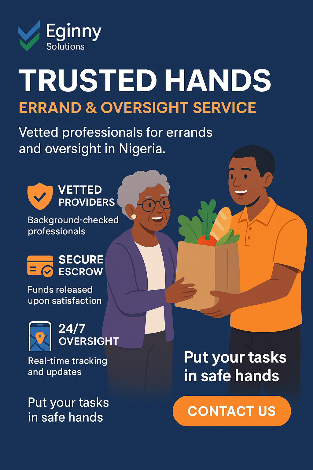At Eginny Solutions, our Trusted Hands Errand & Oversight Service connects you with vetted professionals who handle your tasks with integrity—whether it’s managing home projects 🏠, caring for family abroad ❤️, or running essential errands in Nigeria 📦.